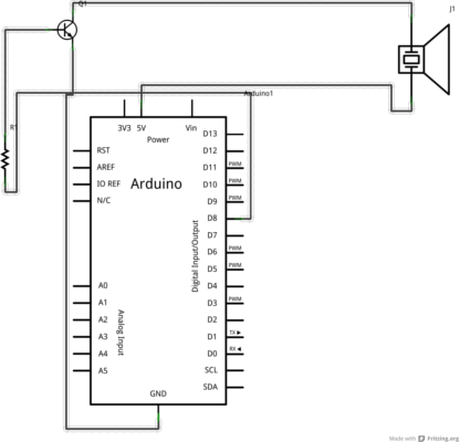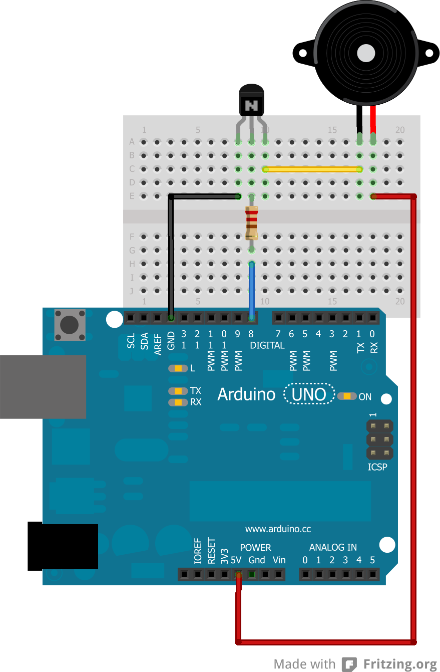 Cómo vemos en la imagen, además de el Arduino y el zumbador necesitaremos un transistor. Esto se debe a que los pines de Arduino sólo pueden dar una corriente máxima de 25mA, insuficientes para producir sonido con el zumbador. La misión del transistor es amplificar esa señal.