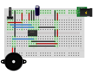 Con este circuito puedes producir sonidos en distintas frecuencias al manipular la resistencia variable del circuito. Es poco preciso ya que es complicado ajustar exactamente una frecuencia, pero te servirá para hacerte una idea de como afecta el ancho del pulso al sonido emitido.