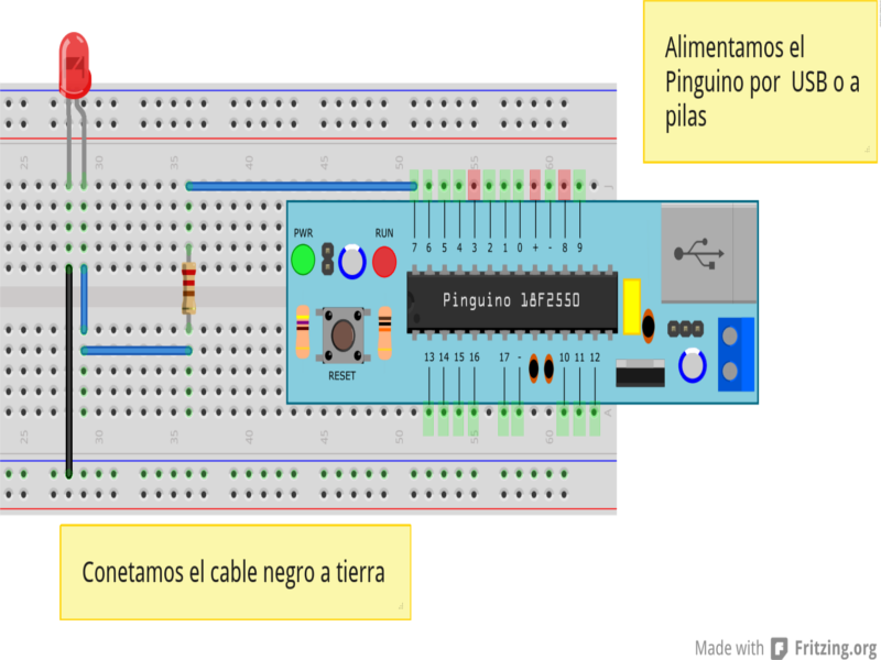 Continuamos aprendiendo a usar Pinguino y lo hacemos creando, cargando y comprobando el funcionamiento de nuestro programa. En esta ocasión, cómo suele ser habitual en electronica, nuestro «Hola mundo» será un led que parpadea. Veamos primero el montaje y a continuación lo que tendremos que programar para hacerlo funcionar: