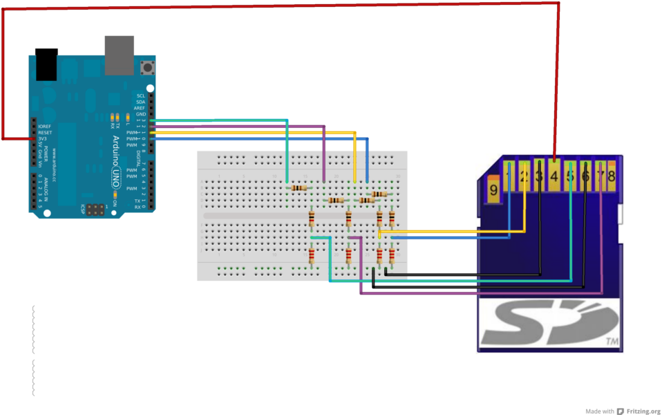 Esa forma de colocar las resistencias se conoce cómo divisor de tensión, es la forma más sencilla (y barata) de evitar que las señales de Arduino (que van a 5V) quemen la tarjeta SD.