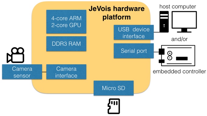 JeVois es actualmente un Kickstarter, pero ya ha superado la cantidad mínima que necesitaba para hacerse realidad. Se trata de  un sensor de vídeo cuyas imágenes son procesadas por la CPU quad-core  y los resultados enviados mediantes sus salidas USB y puerto serie. Los algoritmos de visión artificial se cargan en una tarjeta SD y se insertan en el propio modulo, a partir de ese momento JeVois comienza a procesar lo que aparece en su campo de visión y nos devuelve una salida ya procesada.