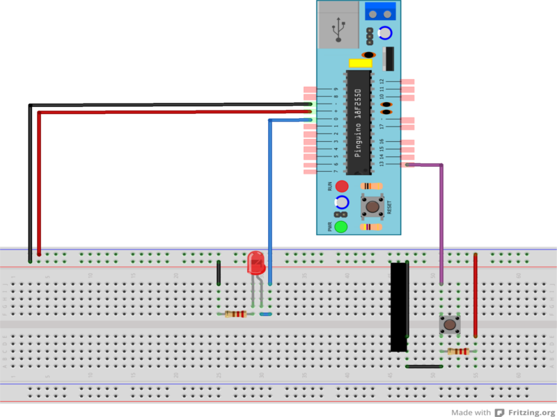 El Circuito en sí es muy sencillo, únicamente necesitaremos un pulsador, un par de resistencias , un led y por supuesto, nuestro Pingüino.