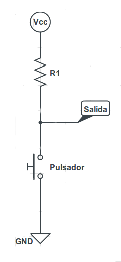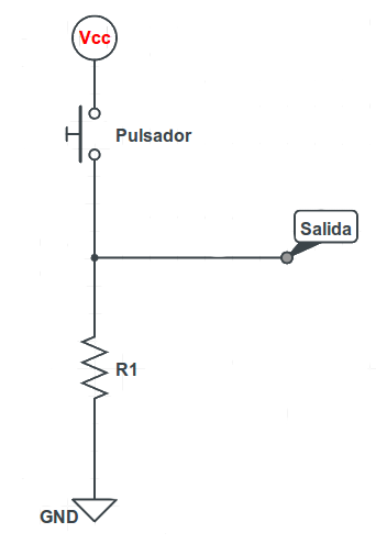 Si optamos por una resistencia Pull-Down pasaŕá lo mismo pero a la inversa. En reposo tendremos una tensión que se considera un 0 y al pulsar la corriente llegará desde el Vcc entregándonos un 1.